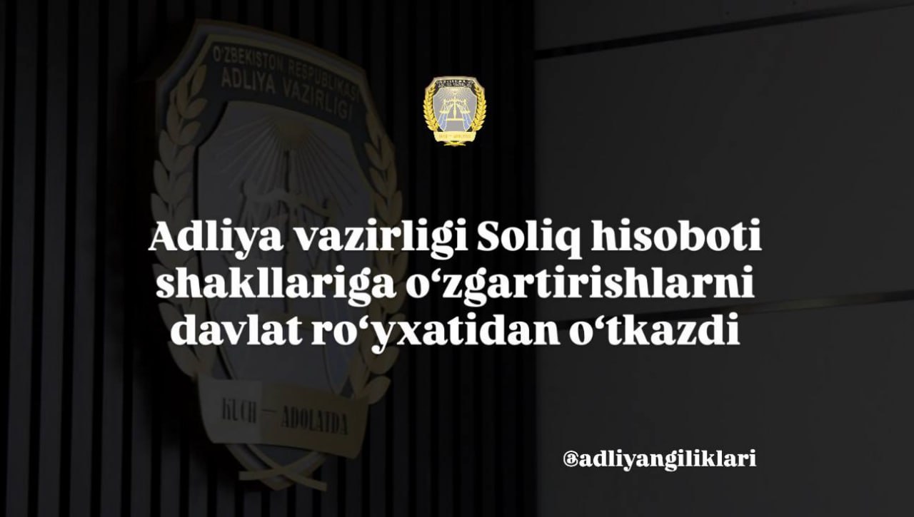 Adliya vazirligi Soliq hisoboti shakllariga o‘zgartirishlarni davlat ro‘yxatidan o‘tkazdi (ro‘yxat raqami 3221-8, 2025-yil 26-noyabr).